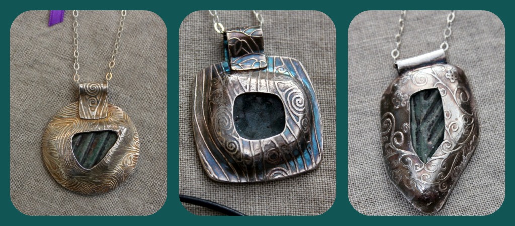 Eventually—just last fall—I had an epiphany about the shards of mug. It occurred to me that stoneware is fired well above the temperature at which I fire silver clay, which meant that I was easily able to incorporate those shards into my jewelry designs. I could create with this broken thing; I could transform the mug and my grief about it into something new and very beautiful.